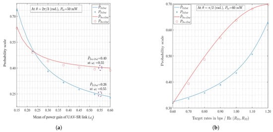 The connection outage probability is defined as the probability that the spectral efficiency (channel capacity) of the UAV-SR link () falls below the target transmission rate () [27]. Thus, the connection outage probability is expressed as
