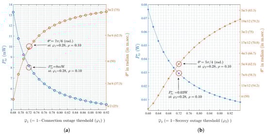 Figure 3 shows the variations of for the EH splitting ratio () depending on and mW. It is seen that is a decreasing function with respect to . A higher is achieved with the lower values of because ()-fraction of the received power is used for the EH process. Figure 4a shows the connection and secrecy outage probabilities, and , respectively, as the functions of the expected channel gain, . The secondary channel and secrecy capacities, , and , respectively, increase with . Thus, both , and decrease with the increase in . Figure 4b shows that both the connection and secrecy outage probabilities increase with the target transmission rate () and target secrecy rate (), respectively.
