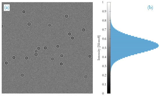 (a) example of a typical detection plane at low particle number concentration with overlapping fringe patterns and patterns of different extent as a result of the -location in the sampling channel; (b) the normalized intensity histogram.