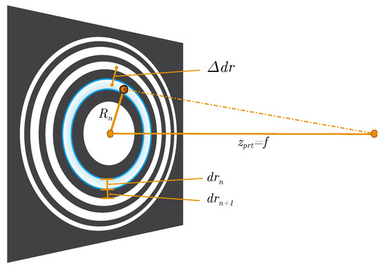 The formation of fringe patterns can be described by the Angular Spectrum Method (ASM) as in [9]. A fringe pattern, however, also largely complies with a sinusoidal Fresnel Zone Plate (FZP) [7] which is primarily used to focus light, based on diffraction. The spacing of zones is such that light transmitted by the transparent zones constructively interferes at a desired focus. Holograms follow the same principle, i.e., its interference rings are caused by a common focus point—the particle. The idea here is to make use of the analogy to zone plates to easily estimate the extent of fringe patterns. As the focal length f in Figure 3 corresponds to the distance from the particle to the detection plane, each zone n may be interpreted as a fringe of radius [10]: