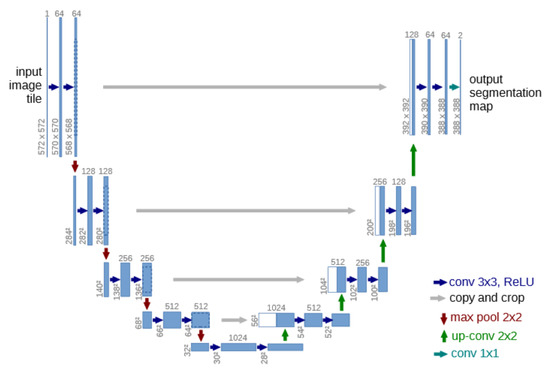 The network architecture is depicted in Figure 4 and is based on the principle of a U-Net structure [30]. In total, the network has 23 convolutional layers. It comprises a contracting information path (left path) and an expansive path (right path). The contracting path follows the architecture of a convolutional network and includes the successive application of two 3 × 3 convolutions, each followed by a Rectified Linear Unit (ReLu) for activation and a 2 × 2 max pooling operation for downsampling. At each downsampling step, the number of feature channels is doubled. Every step in the expansive path consists of an upsampling of the feature map followed by a 2 × 2 convolution, a concatenation with a correspondingly cropped feature map from the contracting path, and two 3 × 3 convolutions, followed by a ReLu. Cropping is required due to the loss of boarder pixels at every convolution.