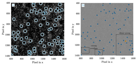 Detection result of the customized HT (selected image section) (a) Gaussian filtered fringe patterns () where all detected fringes are highlighted with circles; (b) the original fringe patterns. Its determined centroids equal the actual position of the particles in the - plane. There is one missing hit (orange).
