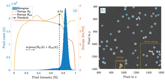 With maximum entropy thresholding, the optimal intensity threshold is found where the best contrast is obtained in terms of maximum information transfer. Its indicative measure is the maximum sum entropy . Figure 6a shows the determination of the sum entropy with the entropy of bright pixels and the entropy of dark pixels plotted separately. In this particular example image, the correct optimum threshold is located close to the left of the mainlobe at . However, the algorithm would actually fail to find that threshold because the background entropy gains a peak at lower pixel intensities (at ) and the actual maximum sum entropy would be erroneously reached at that particular threshold value. To avoid such misinterpretations, the thresholding limits and in Equation (8) are introduced. The upper limit equals the histogram bin of the mainlobe peak and is determined for each sample image individually. Evident from the given fringe pattern properties, the intensity of blobs will not exceed background levels and is therefore always located left of the mainlobe. is a rather empirical value and is set to as a threshold for right-sided histograms.