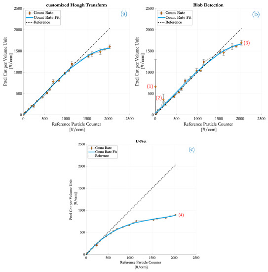 Comparison of the monitored particle number concentration to the counting rates obtained by the PIU. (a) customized HT; (b) blob detection with maximum entropy thresholding; (c) DCNN based on a U-Net.