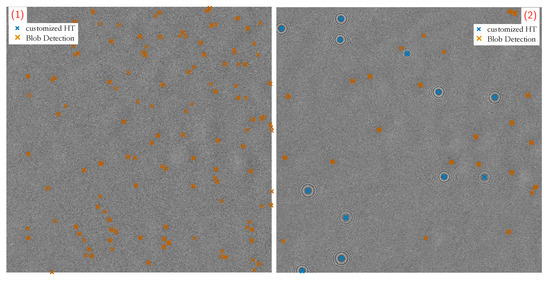 Zoomed segments of measurement samples from Figure 7b that suffer strong background fluctuations: (1) zero-particle frame; (2) particle number concentration of #/cm; while the customized HT outputs correct hits (only True Positives), the blob detection in both scenarios fails (also False Positives) because of a misinterpreted intensity threshold in the histogram.