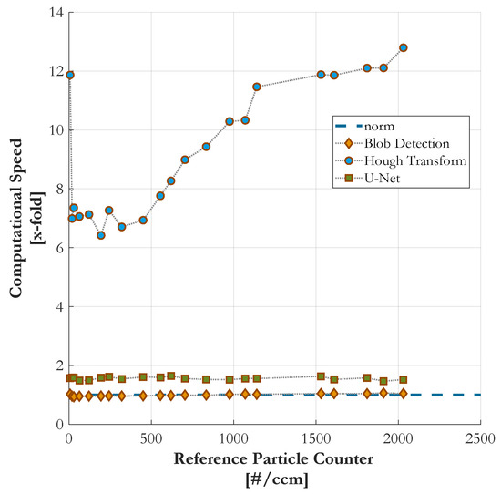 The comparison of computational speed is also based on the dataset of the ramped particle number concentration, also used in Section 4.4. The processing time of all three presented counting methods is examined on every sample point of the measurement curve. These sample points of are directly proportional to the counting rate of particles N as given in Equation (12). Figure 9 compares the computational speed of the methods as a function of particle number concentration. It has to be mentioned that both the blob detection and the customized HT are MatLab based algorithms which are executed on CPU without GPU support. The U-Net, on the other hand, is a Python script running on a GPU which is optimized for Artificial Intelligence (AI) applications.