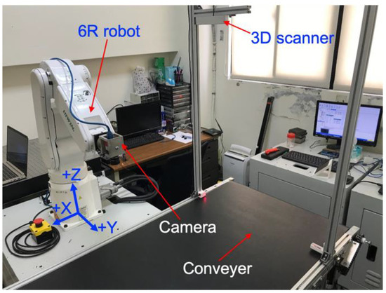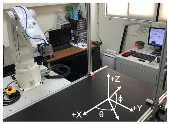 Experimental setup of the inline inspection (X-Y-Z is the origin of the robot coordinate).