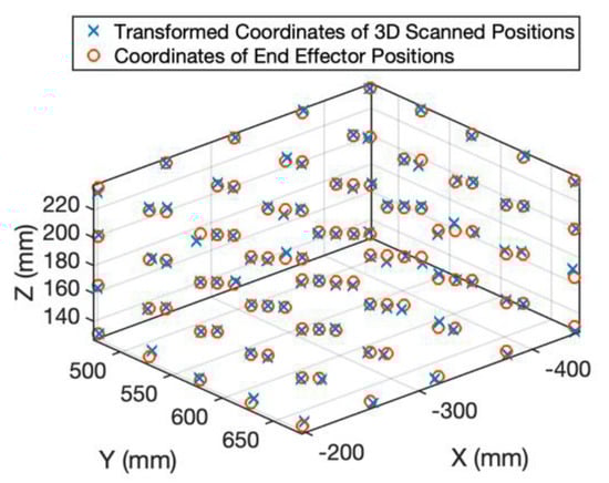 The coordinates of the end effector positions and the transformed coordinates of the 3D scanned positions.
