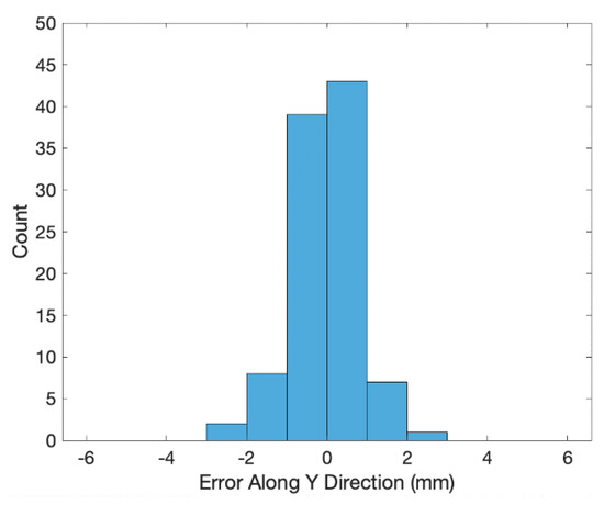 Histogram of errors along Y direction between the end effector coordinates and transformed coordinates of the 3D scanned positions.