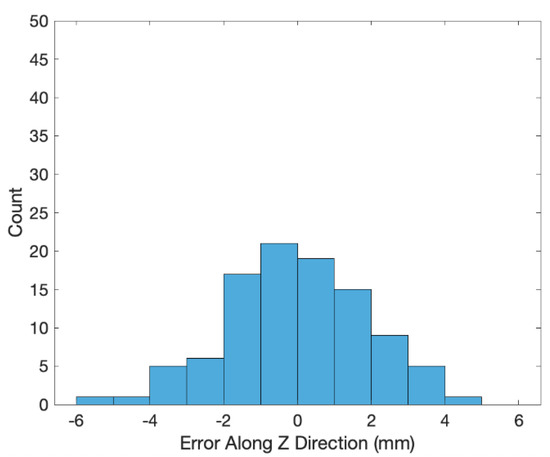 Histogram of errors along Z direction between the end effector coordinates and transformed coordinates of the 3D scanned positions.