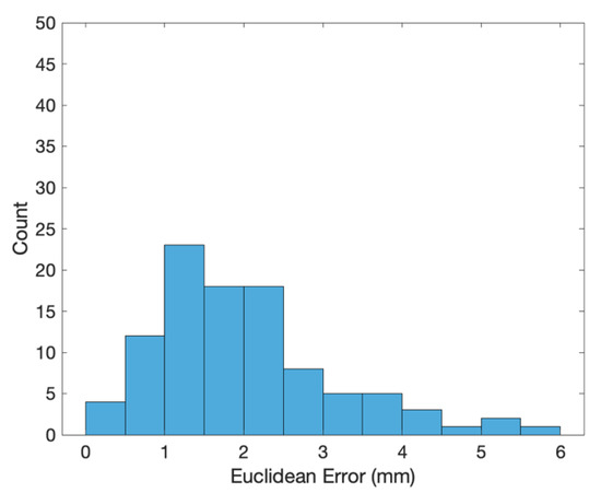 Histogram of Euclidean errors between the end effector coordinates and transformed coordinates of the 3D scanned positions.