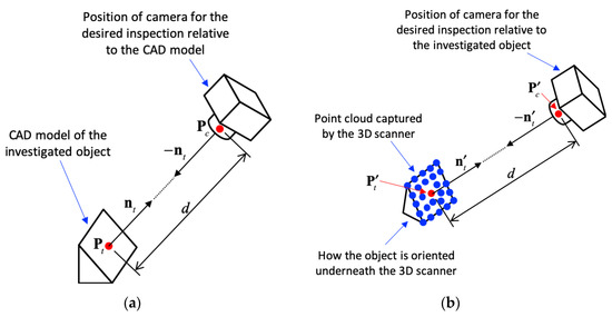 Position of the camera for the desired inspection: (a) relative to the CAD model of the investigated object; (b) relative to the point cloud of the object captured by 3D scanner.