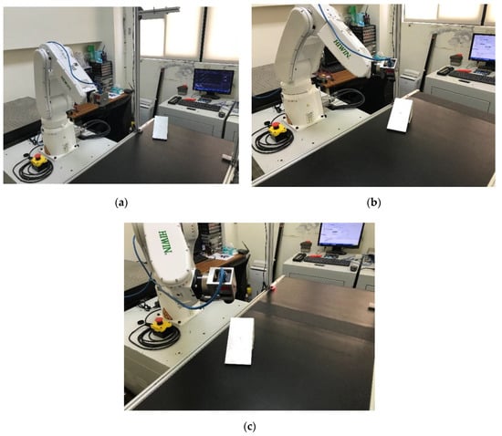where and represent the minimal and maximal X-coordinates of the working range of the robot, respectively. Finally, the coordinates of the end effector for following the object and performing the desired inspection were determined, i.e., , , …, . At each time , the desired position and orientation of the end effector were computed based on the inverse kinematics in the motor control system.