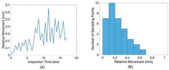 The relative movement of the center of the circular mark between each consecutive inspection image: (a) analysis with respect to time, (b) histogram of analysis.