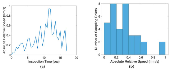 The absolute relative speed of the center of the circular mark between each consecutive inspection image: (a) analysis with respect to time, (b) histogram of analysis.