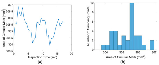 The measured area of the circular mark during the inspection process: (a) analysis with respect to time, (b) histogram of analysis.