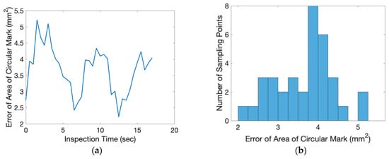 Error of the measured circular area during the inspection process: (a) analysis with respect to time, (b) histogram of analysis.