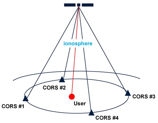 Based on the satellite-by-satellite approach, we assume that the ionospheric delay experienced between the user and a certain satellite can be represented by the mean value of the delays experienced between the network receivers and the same satellite within the measurement cone, depicted in Figure 1, the base of which is formed by the network receiver positions and its vertex from the satellite position. We consider this assumption to be valid in the case of local and regional networks and in the absence of high ionospheric activity. Let us therefore consider the partitioned linear system of equations that relates the vector of observable slant delays of the reference stations, where and , with the vector of the spatial mean ionospheric delays per satellite and the unobservable vector that contains the user-predicted ionospheric delays: