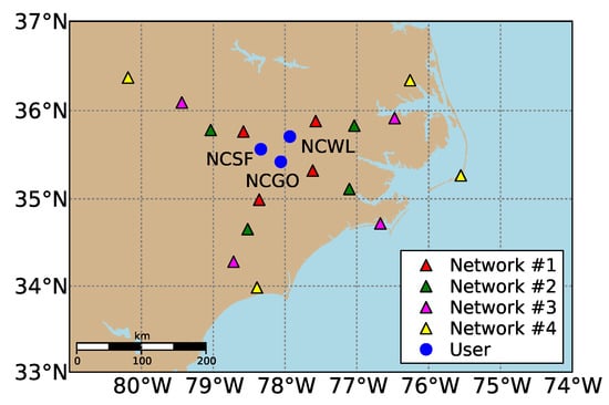 To carry out our case study, we used 24-h GPS dual-frequency code and phase data sampled every 30 s on 16 February 2014 (47th day of year), close to the solar maximum, from mid-latitude CORS receivers of the National Geodetic Survey (NGS) network in North Carolina, United States. Their geographic distribution is shown in Figure 2. To measure the impact of a network’s dimension on the achieved performance, we selected and split the network receivers into four evenly distributed networks; each consisted of four receivers, with average inter-station distances (user-to-reference receiver distances) of 68, 115, 174 and 237 km. The users are denoted by blue dots and are within the coverage of all four networks. During the selected day, there was a medium ionospheric disturbance since the final Kp-index ranged from 2o to 5o with a mean equal to 3+, as determined by GeoForschungsZentrum [38]. The final Kp-index is expressed in a scale of thirds and ranges between 0o, 0+, 1−, 1o, 1+ … all the way up to 9o (28 values in total).