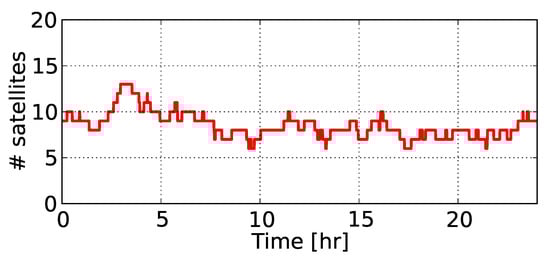 The prevailing advantage of the ionosphere-weighted model becomes clear: one is able to a priori weigh the ionospheric residuals, , according to the ionospheric prediction error that depends on the network density, i.e., the user’s proximity to the network receivers, and improve the performance by this model strengthening. Introducing a priori stochastic pseudo-observables, as shown in Equation (11), extends our functional model of Equation (10), which gets a redundancy gain of at a single epoch compared to the ionosphere-float model.