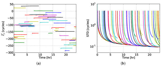 Regarding the PPP-RTK network-derived estimates, we restricted our attention to the satellite phase biases and user-predicted ionospheric corrections. Figure 4 shows the satellite phase bias estimates on L1, , the interpretation of which can be seen from Table 1, along with their formal standard deviations (STDs) as determined from their vc-matrix. We chose to present the estimates of all GPS satellites in order to get a general insight into their behavior. It can be seen that the L1 satellite phase biases of the majority of GPS satellites showed remarkable stability over time. Most of these estimates achieved a formal precision of 0.20 cycles after 1–2 h, while the 0.10 cycles level was reached after 3–4 h. The longer a satellitewas observed from the network, the better the precision of its associated phase biases became over time.