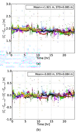 (a) Differences (in meters) of the undifferenced regionally network-derived user-predicted slant ionospheric delays and their counterparts estimated by the user NCWL, and (b) their between-satellite single-differenced results. Each color represents a different GPS satellite. This ionospheric correction prediction is referred to network (mean station spacing of 115 km). The empirical mean and STDs were calculated for the complete 24-h time-series.