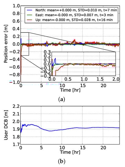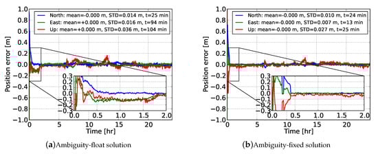 The performance gain via single-receiver PPP-RTK ambiguity resolution is shown in Figure 6b. The benefit in terms of precision is evident at the beginning of the time-series, while this is not the case after a few hours. This is due to the fact that the float ambiguities get more precise over time and as a result the positioning solution’s precision is dictated by the carrier-phase measurements. In the ambiguity-fixed case, the convergence time was reduced to 24, 13 and 25 min along the north, east and up components, respectively, while the accuracy reached the level of 1.0, 0.7 and 2.7 cm, respectively.