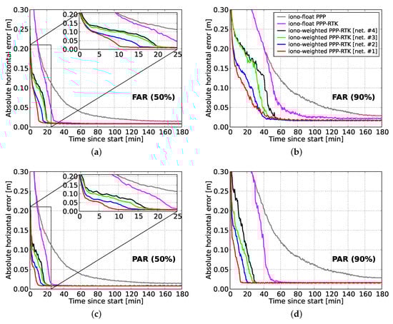Convergence behavior of the horizontal radial positioning errors for (a) 50% of the FAR-based solutions, (b) 90% of the FAR-based solutions, (c) 50% of the PAR-based solutions, and (d) 90% of the PAR-based solutions of all user stations as a function of time since the processing start. The processing window has been re-initialized every 1 min within the selected day for all available solutions and networks.