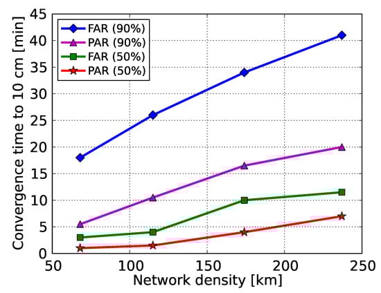 Convergence time of the horizontal radial position errors to 10 cm as a function of the network density for both FAR and PAR, based on 50% and 90% of the sample solutions.