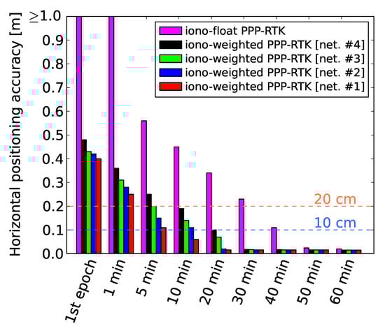 It is also of interest to get an insight into the achieved partially-ambiguity-fixed PPP-RTK user positioning accuracy using external ionospheric corrections. Figure 10 shows the 2D horizontal positioning errors at the first epoch and several minutes since start based on 90% of the sample runs. It can be observed that centimeter-level accuracy could be achieved when a long time span was accumulated in the filter. Although the errors were at the meter-level at the first minute, the regional ionospheric constraints could improve the accuracy by more than 60%, with the accuracy reaching the 25 cm level when corrections from network #1 were used. The differences in the achieved accuracy using ionospheric information from multi-scale networks were evident, which were absent when the time span was longer than 30 min as the underlying model was strong enough to allow for PAR-based cm-level accuracy. It is important to notice here that 20 cm accuracy could be achieved within the first 5 min of processing using a four-receiver network of maximum 174 km spacing, while at the same time the accuracy could be even 11 cm if a 68 km spaced network was used. Using data over a time span of 20 min showed that all networks used in this study were able to provide ionospheric corrections that lead to sub-10 cm horizontal accuracy, while the smallest-scale network can bring the accuracy down to 1.5 cm. If the time span was longer, then it can be seen that the performance was equivalent for all networks. One concludes, therefore, that there is a significant improvement at the first processing epochs by using regional ionospheric corrections, with the performance being linearly scaled based on the network density.