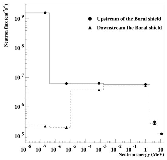 The TRIGA Mark II Reactor at LENA of the University (Pavia, Italy) is a water-cooled and water-moderated reactor. At full power (250 kW), the available flux along the core axis is cm s. Our boards with the devices under test (DUTs) were located at the end of the thermal column, where the neutron beam comes out of a window cm wide. A Boral sheet (aluminum and boron carbide particles between two layers of aluminum cladding) can be placed in front of the window to attenuate the low energy neutrons. In Table 2 are shown the neutron flux components before and after Boral shield. The thermal component of the neutron spectrum, in the case the boral shield is present, is greatly reduced by means the neutron+B reaction, which absorb low-energy (<0.5 eV) thermal neutrons. Neutron flux distributions at the irradiation position shown in Figure 1, were obtained by Monte Carlo simulations using a Monte Carlo N–Particle (MCNP) [22] input file, where the whole reactor structure was described in [23].