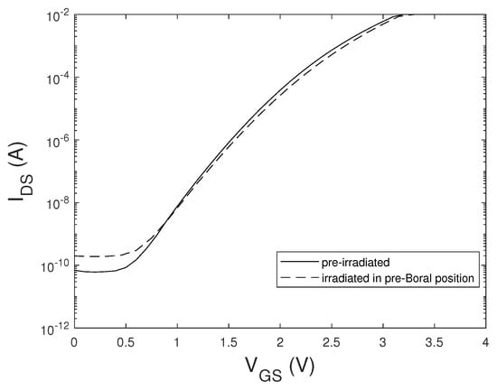 curves at V of a SiC_B MOSFET sample before and immediately after irradiation with thermal and fast neutrons (pre-Boral position).