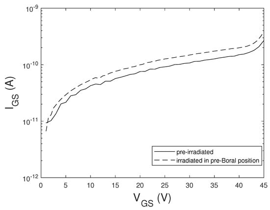 The devices that survived the tests, even those exposed to the thermal component, did not show any significant degradation in their electrical parameters. In Figure 3, the curves of the curves of a SiC_B power MOSFET sample that did not fail during the neutron irradiation test in the pre-Boral position are shown, where the thermal component of the neutron was not attenuated. We only note a slight increase in the leakage current. This increase of the leakage current could not be due to the gamma dose absorbed by the device, which was in the worst case of the order of a few Gy(Si), thus not enough to cause total dose effects on the devices [26]. The estimated value of the gamma dose absorbed by the devices was performed based on the value of the gamma dose rate generated by the interaction of the thermal neutrons with the Boral shield, which was Gy/h with a 250 kW power reactor.