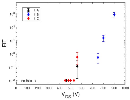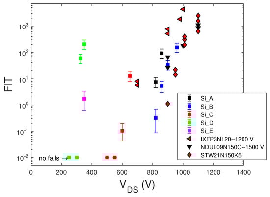 The FIT/cm versus data (not shown) of the investigated Si MOSFETs and IGBTs did not follow a common trend, although general models for cosmic ray-induced failures in silicon power devices exist [28].