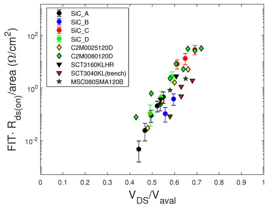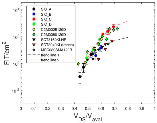 In [11,14,15], the authors asserted that the FIT values (per device active area, FIT/cm) of SiC power MOSFETs versus the voltage scaled to the avalanche voltage () of the device obeyed a universal trend. To verify the validity of this behavior, we show in Figure 8 the FIT/cm versus curves for the tested devices and some devices reported in [11]. We note that at least two trend line curves existed and that the device C2M0080120D overlapped both curves. In particular, we note that at , the confidence intervals of the devices SiC_B and SiC_D did not overlap.