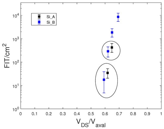 Figure 10 shows FIT/cm versus curves for the Si_A and Si_B MOSFETs. It is well known that the FIT value is proportional to the active area of the devices. The Si MOSFETs Si_A and Si_B were devices made with the same technology, but with different chip sizes. We observed that the ratio of the FIT values, shown in Figure 6, measured at the same was roughly equal to the ratio of the chip size area. Conversely, the circled points in Figure 10 correspond to the same value of the voltage, 820 V and 860 V, respectively, but the FIT/cm values of these devices for the same value did not overlap as expected. This occurred because the values of the Si_A samples were slightly lower (a few tens of volts) than those of the Si_B devices. Therefore, the curves FIT/cm versus showed differences that did not depend on the technology, but on factors that were linked to the typical spread of the technological processes. Hence, these curves could blur the impact of the technology processes over the hardness against cosmic rays.