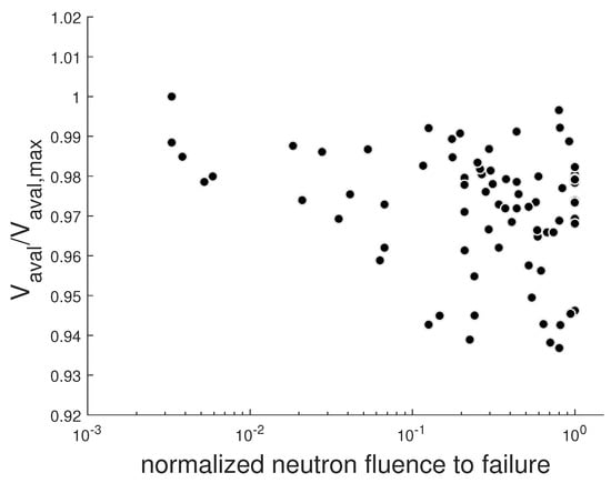 We now discuss the issue concerning the comparison of the FIT values of different devices as a function of the voltage normalized to the avalanche voltage . In particular, we investigated the correlation between the value and the probability of the failure event, to determine if SEB events under neutrons exposure were more likely in devices with lower values. For a given irradiation run of the same part number device, we calculated the avalanche voltage values of each failed device normalized to the maximum value calculated over all the failed devices. The neutron fluences to fail, in the same run, were normalized to their maximum value. To improve the statistics, we collected together the data of different runs of the same part number. In Figure 11, the result of this analysis for the SiC_A SiC MOSFET are shown. We note the lack of correlation between the avalanche voltage and the neutron fluence to failure for the SiC_A device. The same result was obtained for the other investigated devices. Therefore, the failure events were not more probable in devices with a lower value.