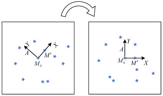 After the star map captured by the star sensor is denoised (centroid estimation, etc.), the star points on the star map often have different coordinates because of the different shooting angles of the star sensor. To ensure that our algorithm is not affected by the shooting angle of the star sensor (rotation invariance), we defined the plane coordinate system by selecting stars from the observed star map.