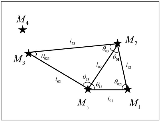 For the first view, we selected as the auxiliary star and used the star sets and to construct double triangles. Let represent the angle of the triangle and l represent the edge length of the triangle. At this point, we can construct the double-triangle feature in the first view as .