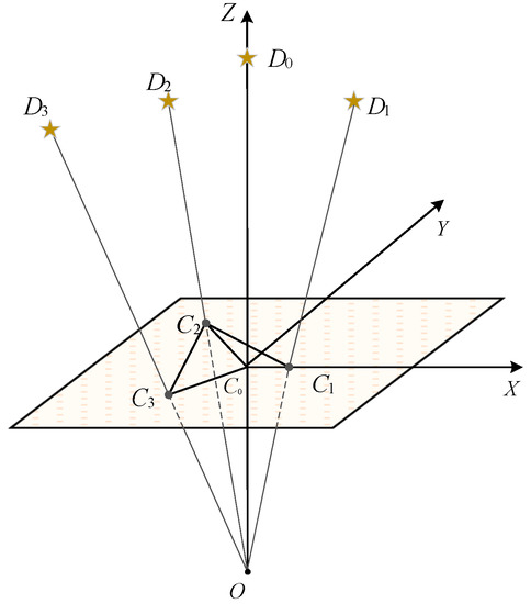 To make the reference star point and the set C in a unique coordinate system, we defined the plane coordinate system by guide stars in the guide star catalog. In other words, we selected the star (which is the closest point to the in C) as the auxiliary star to establish the coordinate system. In this case, we can establish a new coordinate system, where the vector is the X axis, the ’s counter-clockwise orthogonal vector on the tangent plane is the Y axis, and the vector is the Z axis. Where