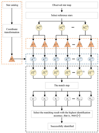 The MVDT-SI algorithm contains four steps. First, the coordinate system of the guide star catalog is transformed to obtain the two-dimensional coordinate representation of each guide star under different reference stars. Then, in order to ensure the coordinates and features of the observed star map are not affected by the shooting angle of the star sensor, we defined the rules for determining the coordinate system of the observed star map. Then, we constructed the multi-view double-triangle features for the observed star map and guide star features for the guide star catalog. Finally, by comparing the differences between their features, we obtained the number of each star point on the observed star map.