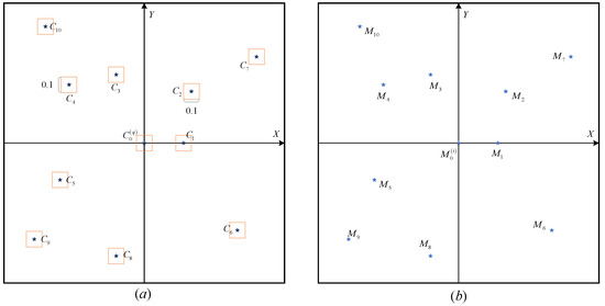 - The third step is to identify all the star points in the observed map based on the reference stars. Based on the second step, we can obtain the number of the reference star in the observed star map which is corresponding to the star (the projection point is , ) in the guide star catalog. Therefore, through the operation of the Section 4.1 and Section 4.2, we can get the standardized star maps of the guide star map and the observed star map. First, as shown in the Figure 6, we created boxes (size unit) whose centers are stars in the guide star map. Next, we determined whether the stars in the observed star map are in these boxes. If one star point on the observed star map falls into a box of the guide star map, the star point will be marked with the corresponding number of the guide star. If the star point falls into multiple boxes at the same time, the point is marked with the corresponding number of the guide star with the smallest magnitude within the box. Otherwise, it is marked as −1.