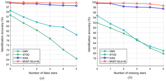 As was described in Section 5.1 of this paper, there are always “false stars” or “missing stars” in the observed star map. The performance of the star identification algorithms for the case of “false star” or “missing star” is shown in Figure 9. In the case of false stars or missing stars added to the observed star map, GMV and STOD will fail drastically. In this scenario, GMV, which is based on voting of the Euclidean distances of the neighboring stars from the reference star fails because the vote count for the reference star reduces due to the missed neighboring stars. STOD fails as well because it searches the tree database with the number of neighboring stars as the parameter. The SISS algorithm and our algorithm maintains a high robustness in this case. It can be seen that our MVDT-SI () algorithm has stronger algorithm robustness.