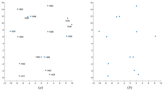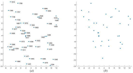 Figure 6. Star point number matching in the observed star map. (a) The standardized star map of the guide star map. (b) The standardized star map of the observed star map. - Finally, the star identification results r of different star points in different views are calculated. The statistical value of star identification result r is increased by 1 for each successful star identification. In other words, the star identification results r is the number of star points on the observed map which is not marked as −1. According to the identification results of reference stars in different views, the results with the most successful star identification is selected as the final number of the star points in the observed star map.