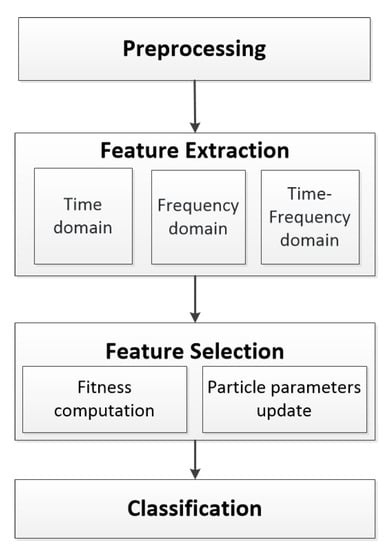 There are currently many methods available for feature extraction. For example, Arnau-González et al. [12] selected features from the spatial domain and frequency by principal component analysis, and found that naive Bayes, support vector machine (SVM) RBF, and SVM-sigmoid classifiers can significantly improve the accuracy of classification, in which the best accuracy is 67.7% for arousal and 69.6% for valence. Zhong et al. [13] developed a new approach for EEG feature selection, which transferred recursive feature elimination and implemented a linear least square SVM classification, so that the arousal accuracy reached 78.7% and the valence accuracy reached 78.8%. In addition, as a population-based stochastic optimization method, the particle swarm optimization (PSO) method, is becoming more and more popular in the field of feature extraction due to its simple mathematical operations, a small number of control parameters, fast convergence, and easy implementation. Several PSO variants have shown good performance in function optimization and feature selection [14]. For example, Kumar et al. [15] proposed a supervised PSO-based rough set for feature selection of the BCI multiclass motor imagery task, and the outcome outperformed other algorithms using the same dataset. As an important parameter in PSO, the inertia weight is often used to balance the global exploration and local exploitation of the search process. PSO with linearly-decreasing inertia weight (LDW-PSO) [16] was recommended due to its good performance on optimization problems. However, few studies currently use the PSO method for EEG-based emotion recognition.