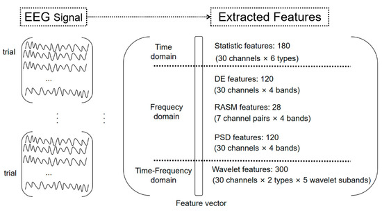 For the online BCI system, a total of 748 emotion-related EEG features were extracted from the EEG signal on three aspects, namely time-domain, frequency domain, and time-frequency domain in each trial. Figure 3 illustrates the data processing process from EEG recording to feature extraction for each subject. It can be seen from Figure 3 that these 748 features generate a feature matrix.