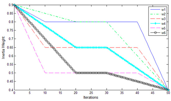 where tmax and t are the maximum number of iterations and the current iteration. In this study, tmax = 50, ws = 0.9, we = 0.4, and wm, t1, and t2 are the multi-stage parameters. Table 1 lists the multi-stage parameters of the six selected MLDW strategies, called w1-w6. The curves of these strategies are plotted in Figure 4.
