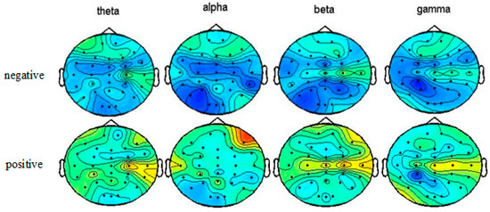 In order to verify whether our online emotion recognition system can evoke positive and negative emotions, we plotted topographical maps of the average DE features across trials of ten subjects with happy or sad emotional states in four bands (theta, alpha, beta, and gamma bands). Specifically, the features were averaged across all ten healthy subjects and all trials. As shown in Figure 5, the brain neural activity is different when watching negative videos and positive videos. The brain neural activity map of positive emotions show higher power than negative emotions. In the theta and beta bands, the right frontal lobe area and right temporal area were more activated in the positive emotion state than the negative emotion state. In the gamma band, the left occipital lobe and the right temporal lobe regions show higher power in the positive emotion than the negative emotion. These patterns are consistent with those reported in previous studies [37,38]. These findings also proved that our outstanding recognition accuracies were not the result of EMG activities.