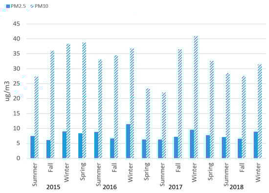 Figure 1 shows median annual 24-h average PM2.5 and PM10 values from the Network during the 2015–2018 period. Median PM2.5 levels from the Network appear to be highest in winter, but there was no overall trend in increasing levels by time (Figure 1). Average 24-h PM2.5 values ranged from <1 to 255 μg/m3 during the time period. PM10 values also were highest in winter (Figure 1), except for Spring 2016 being the highest for that year. PM10 values ranged from 1.8 to 2431 μg/m3.