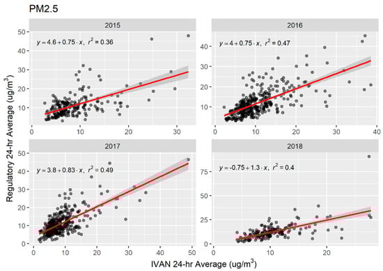 Scatter plots of mean 24-h averages of PM2.5 from Community Network (IVAN) and regulatory monitors, 2015–2018, by year. OLS simple linear regression lines shown in red with 95% confidence intervals (grey band).